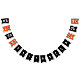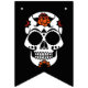 Cool Halloween bunting banner done in orange and black backgrounds, with graphics of a white sugar skull with orange and black flowers and white text. The white text, set in the middle flags, on black background, can be personalised to read what you want.  Matching paper napkins, invitations, paper cups, and other party supplies are available.