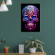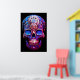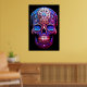 Sugar Skull image in blue and red, with a black background, on a wall poster.