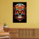 Sugar Skull design, in bright colors, including blue and orange, on a wall poster. Celebrate Day of the Dead, November 1-2.