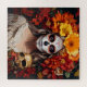 A celebration of life and death is a sugar skull lady—a striking embodiment of both beauty and mortality. Her face is intricately adorned with vibrant Día de los Muertos patterns. Her eyes are surrounded by petals reminiscent of marigolds. Cascading from her hair are colourful flowers and a skull with hollow eye sockets.