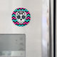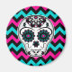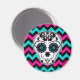 A sugar skull with black, hot pink, and turquoise accents on a chevron pattern background in matching colours. Shown here on a magnet.