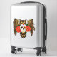 A great horned owl with a day of the dead sugar skull and red roses in a backdrop of orange.
