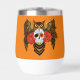 A brown great horned owl with a day fo the dead sugar skull and red roses in a backdrop of orange.