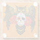 A brown great horned owl with a day of the dead sugar skull and red roses in a backdrop of orange