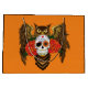 A brown great horned owl with a day of the dead sugar skull with red roses in a backdrop of orange