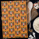 A brown great horned owl with a day of the dead sugar skull and red roses in a backdrop of orange.
