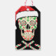 The front has a Christmas themed sugar skull with a Santa hat, peppermint eyes and candy cane crossbones. The back has space to write in names for "to" and "from", says happy holidays and is decorated with a peppermint. The background colours and type are customisable.