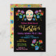 Colourful and pretty Mexican FIesta Bridal Shower invitations. Can change wording to any Fiesta themed event. Features hand drawn embroidered stitched flowers, sugar skull and maracas on a black background. Faux gold foil font and back.