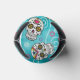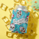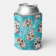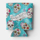 A colourful can cooler design for Day of the Dead festivities, featuring a variety of decorative sugar skulls with flower and swirl accents on a textured-effect turquoise blue background. If preferred, the provided 'Feliz Dia de los Muertos' banner and text layer can be deleted to use this design for other occasions. Search ID725 to see other colour choices and products with this fun pattern.