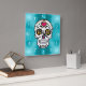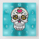 A colourful wall clock design for Day of the Dead festivities, featuring a decorative sugar skull with flower, heart and swirl accents on a textured-effect turquoise blue background. Search ID725 to see other colour choices and products with this fun pattern.