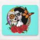 A sugar skull sits in behind a woman wearing day of the dead sugar skull make-up all drawn in an art nouveau style.