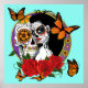 A sugar skull sits in behind a woman wearing sugar skull make-up. All drawn in an Art Nouveau style.
