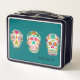 Dia De Los Muertos style sugar skulls illustrations are set against a teal coloured background on this lunchbox that's ready to be personalised with a name on the front.