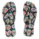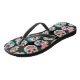 Bright images of sugar skulls make a colourful pattern on these fun flip flops. There are several different skull images, all individual in various colours, along with a boho style pattern snake. The images are placed on a black background.