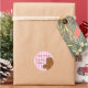 Customisable Christmas sticker with an adorable little gingerbread man with pink candy nose and buttons and white frosting. Pink and white striped background. Great as gift tags! Coordinated gift tags, note cards, postage stamps, stationery and mugs also available! PinkInkArt original!