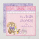 This adorable puppy smiles at your guests and invites them to share in your special day for your baby shower. The artwork is hand watercolored and contains a stuffed puppy with purple bow on her neck, a purple pacifier and pink rosebud booties. The background is a soft pink with hand painted white swirls, a hand painted scalloped cross stitch lace and rick rack border overlaying a contemporary swirl heart paper at the top. The reverse side has a purple and lavender background with dots and circles. On top of this border is a baby bottle, a binkie and the pair of rose bud shoes. There are a wide range of products designed to coordinate for a complete baby set. YOU MIGHT ALSO ENJOY:
