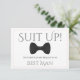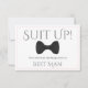 Use this "best man proposal card" to ask your special friend, brother, or other family member to be the best man at your wedding. It features an image of a black bow tie on a white background and a thin pink border. The text says: Suit Up! Your Services are Requested as Best Man" There is a space to enter a special note asking "will you be my best man?" as well as the wedding couple's names and wedding date. All fields are fully customisable.