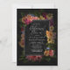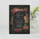 Lush floral arrangements in bright, warm colours ranging from coral and rose pink to golden yellow combine with vignetted, obsidian backgrounds to give the pieces in this elegant wedding suite a dark, moody ambience. This wedding rehearsal dinner invitation features a border of abundant flowers around a black label framed in white. Add your event details using the provided template. Search ID829 to see the complete collection.