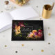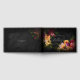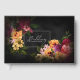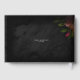 Lush floral arrangements in bright, warm colours ranging from coral and rose pink to golden yellow combine with vignetted, obsidian backgrounds to give the pieces in this elegant wedding suite a dark, moody ambience. This wedding guest book features elegant, handwritten calligraphy, and corner floral arrangements around a white-bordered frame . Add your names and wedding date on the reverse using the provided template. Search ID829 to see the complete collection.