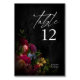 Lush floral arrangements in bright, warm colours ranging from coral and rose pink to golden yellow combine with vignetted, obsidian backgrounds to give the pieces in this elegant wedding suite a dark, moody ambience. This wedding table number card features a lower corner border of flowers with 'table' in striking calligraphy along with your names and wedding date in white. Search ID829 to see the complete collection.