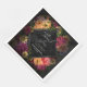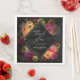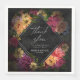 Lush floral arrangements in bright, warm colours ranging from coral and rose pink to golden yellow combine with vignetted, obsidian backgrounds to give the pieces in this elegant wedding suite a dark, moody ambience. This wedding paper napkin features abundant flowers around a diamond- shaped frame to hold your names, wedding date and a personal message. Search ID829 to see the complete collection.