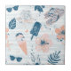 Ceramic Tile - Summer beach pattern with sunglasses, straw hat, flip-flops, ice cream, hibiscus flowers, and starfish in blue and coral tones over striped background. Distressed textured style with a relaxed tropical vacation vibe. Ideal for beach lovers, vacation goers, summer trend fans, and coastal lifestyle enthusiasts.