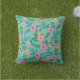 Add some bright and colourful style to your patio, backyard or pool area this summer with our tropical floral pattern outdoor pillow. Square or lumbar throw pillow features coral and pink flowers and lush green leaves on a vibrant turquoise aqua background. Pops of bright pink and green give this pillow a modern tropical feel, making it a perfect choice for your poolside or patio decor! Design repeats on reverse.