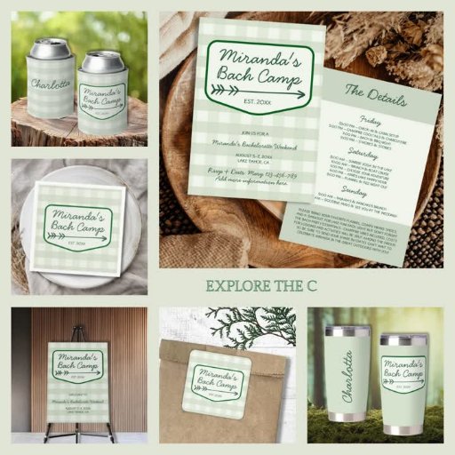 🌲 Rustic & Charming Design: Featuring a sage green gingham or flannel background, this invitation captures the cosy, outdoorsy vibe of a summer camp bachelorette. A camping-style badge showcases the bride’s name, “Bach Camp,” and the established year, giving it a personal and nostalgic touch.