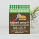 This cookout party invitation features a cheeseburger and a spatula and a green chequered tablecloth and text fields for your party information.