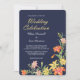The floral wedding theme gets an updated, modern look with this bold and bright wedding invitation. It features a watercolor daylilies floral corner border on a dramatic navy blue background. Colours included are salmon pink, bright yellow, tangerine orange and green. Your custom text is in white at the centre, with the typography "Wedding Celebration" in gold. The back of the invitation is solid matching navy blue, with a top border of daylilies in the same colours. Be sure to see the matching wedding products in our store.