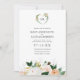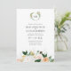 Modern botanical hand-painted wedding invitation featuring watercolor bottom border of flowers, eucalyptus leaves, orange slice, and foliage in an fresh palette of white, ivory orange, green and pink hues framing your names and wedding details. Your monograms or Initials are framed by a heart shaped frame of leaves, foliage and spring flowers.