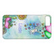 This adorable iphone case has a sponged blue, green and purple background. The lower left has a wheelbarrow with flowers and little bees buzzing about. At the top a whimsical little bunny rabbit is holding onto a pink and green balloon and is floating off into the air with litttle flowers and hearts all around him.