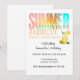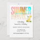 Refreshing summer barbecue, birthday, or party invitation in cheerful summer colours of yellow, orange, and blue, also featuring a thirst-quenching glass of lemonade.