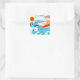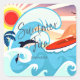 Summer fun, Down Under. Whimsical design in bright colours, all things Australian for beach fun: Surfing, sunshine, palm trees, kangaroos, sandy beach, and a great big smile!