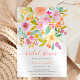 A pretty painted bright and colourful summer garden floral watercolor bridal shower invitation with bold wild flowers in pink, purple, orange, and green leaves with a modern elegant script font.