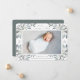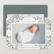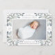 Elegant botanical birth announcement in chic shades of green features a single full bleed horizontal or landscape orientated photo with clusters of delicate dusty green-grey watercolor leaves and white berries at the corners. Personalise with baby's name, birth stats, and a personal message, and add three additional square photos to the back.