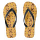 Flip flops with a seamless repeating summer geometric pattern. The pattern is mirrored, golden yellow and black