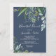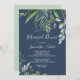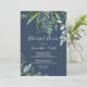 This summer greenery navy rehearsal dinner invitation is perfect for an elegant midsummer wedding rehearsal. The botanical design features a lush arrangement of painted watercolor eucalyptus, greenery, and green leaves on a navy blue background.