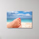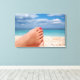 Canvas print of women's feet with pink red nail polish on a white beach on an island in the mediterranean sea relaxing during the summer holidays.