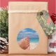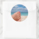 Round photo sticker with women's feet with pink red nail polish on a white beach on an island in the mediterranean sea relaxing during the summer holidays.
