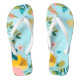 A pair of colourful flip-flops adorned with floral patterns on a bright blue background.