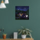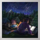 Starry Night art by Traci Van Wagoner print, posters, accessories, and gifts features our original painting of two kids and their big, black dog camping out under the stars reading a fantastical book around a camp fire about knights and dragons. The magic of the story is swirling up into the starry sky to show a knight and a dragon in an eternal nighttime dance of stars. Enjoy a summer night camp out in the mountains.