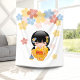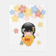 Vector illustration of a cute oriental girl in a bright yellow kimono dress with wide obi sash holding a blue kinchaku drawstring bag. The girl's black hair is decorated with flowers and geisha style hairpins. This artwork was inspired by traditional kokeshi dolls of Japan. Large colourful flowers shaped like Sakura blossom make a simple background.
