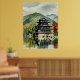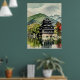 This serene watercolor-style painting features a majestic Japanese castle nestled beside a tranquil lake, surrounded by lush summer foliage. Soft green mountains rise in the background, while vibrant touches of red and gold hint at seasonal change. The castle’s elegant multi-tiered rooftops reflect beautifully in the still water below, creating a peaceful, immersive landscape. Perfect for lovers of Japanese architecture, nature scenes, and calming wall art.