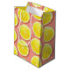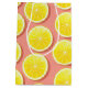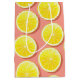 A pattern of fresh & juicy lemon slices in bright, vivid shades of yellow, with a watercolour texture to give it that freshly cut look. They are placed on a salmon pink background for a bright & summery look, like pink lemonade.