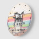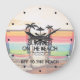 Beautiful beach, ocean waves, colourful sunbeds and a summer badge with palm trees, umbrella, waves and summer on the beach text.