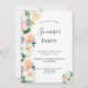 A summery invitation in white, coral and peach . A chic white background on the front. Decorated with large, lush watercolored flowers, florals in white, coral and peach. Template for your name and party information. The word Summer is written with a modern handlettered style script.