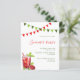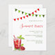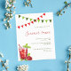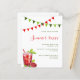 A white background, a red drink and red and green flags as decoration. Templates for your party details, information.