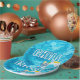 "chill" text in wavy font effect for swimming pool party with cocktail and splashing beach ball in turquoise pool water.