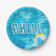 "chill" text in wavy font effect for swimming pool party with splashing beach ball in turquoise pool water.